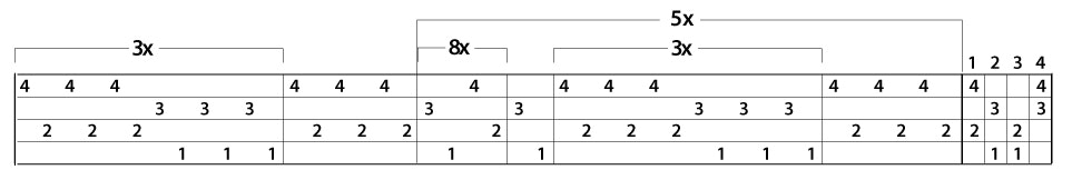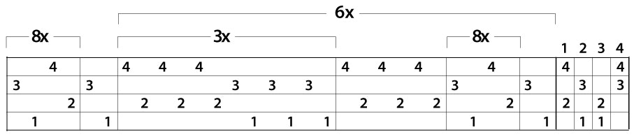 Usually, to change the warp width of a specific draft, you add or subtract repeats in the threading. This is easy if the draft is plain weave or a simple twill, but it can be more complicated and even require changes to the overall design. For this one, the first task is to correlate the threading draft with the design it creates. Notice that the places where 2-4-1-3 are repeated 8x (with a 1-3 to balance), a stripe of very small alternating rectangles is created. These stripes are 34 threads wide, or 1.7". Where the 1-3-1-3-1-3-2-4-2-4-2-4 are repeated 3x (with a 2-4-2-4-2-4 to balance), the stripes in the towel are 42 threads wide (2.1").