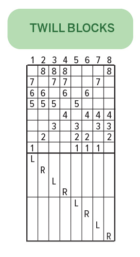 In many twill sequences, odd treadles alternate with even treadles. When I'm weaving twills and the shuttle is on the left, I know I’ll need to use an odd treadle for the next pick; when the shuttle is on the right, I’ll need to use an even treadle. The twill blocks draft shown here demonstrates this pattern.