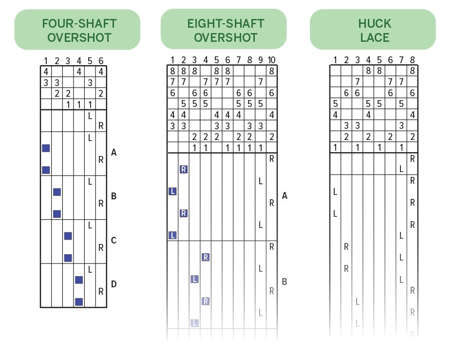But as in the four-shaft overshot example, the same pattern treadles may be used for multiple picks in a row, so you’ll need to watch the fabric as you weave—and use the alternating tabby picks to orient yourself.