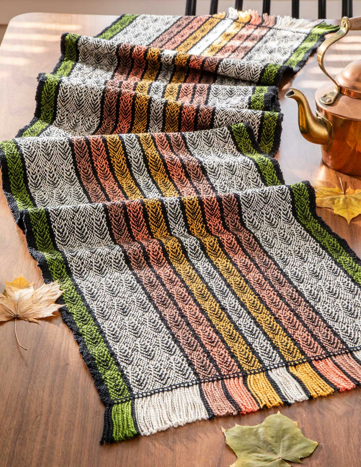 The Falling Leaves Runner by Sue Anne Sullivan, from the Fall 2025 issue of Handwoven, is woven in leafy stripes using warm shades with a touch of green.