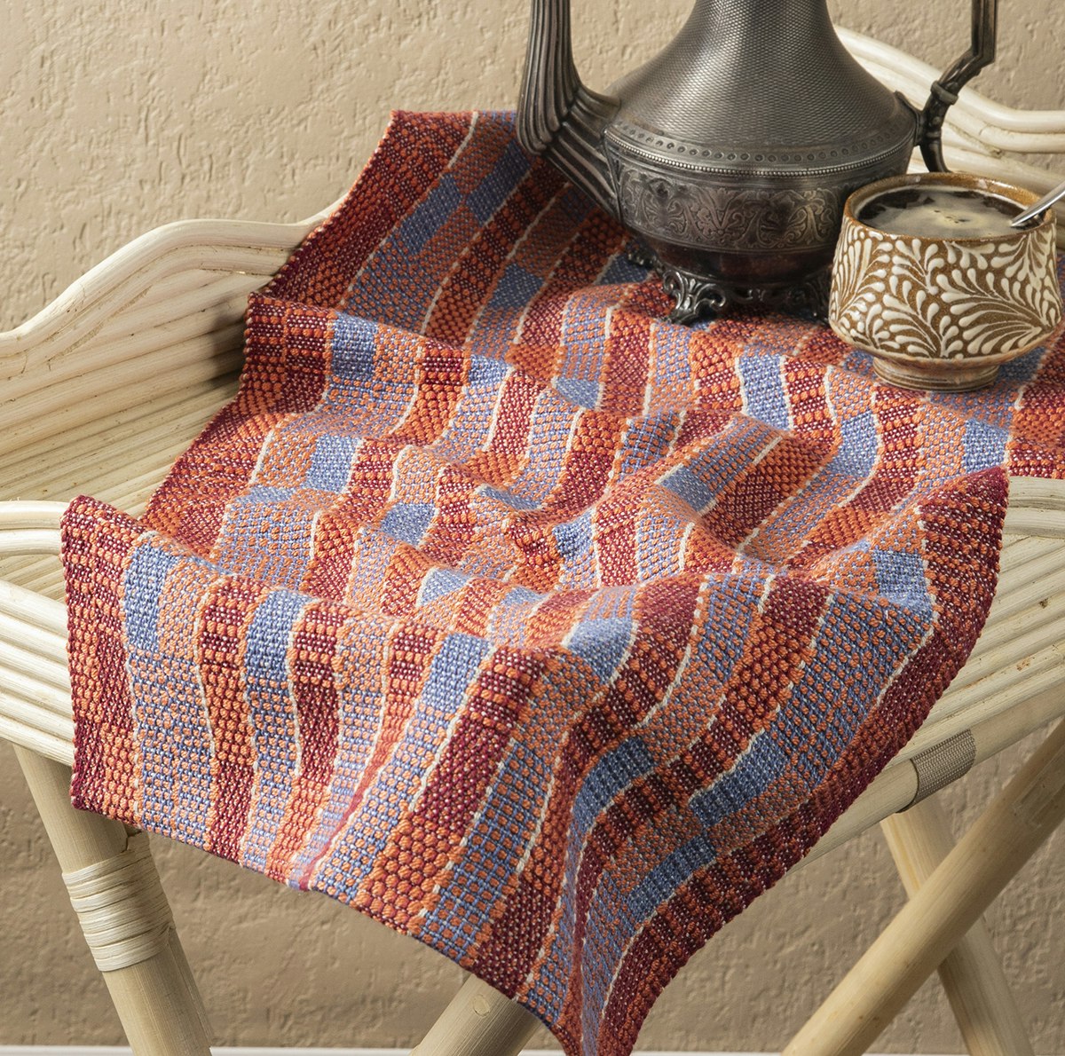 This eight-shaft twill design was inspired by the falling autumn leaves Sue Anne saw out the window as she wove. Pearl cotton in both warp and weft gives the piece a glow—weave it to add a seasonal touch to your table.
