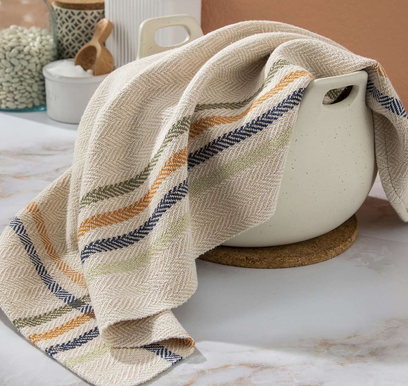 The Broken Stripe Towel design by Patty Crane, from the May/June 2022 issue of Handwoven, brings twill stripes with the warm colors of autumn into the kitchen.
