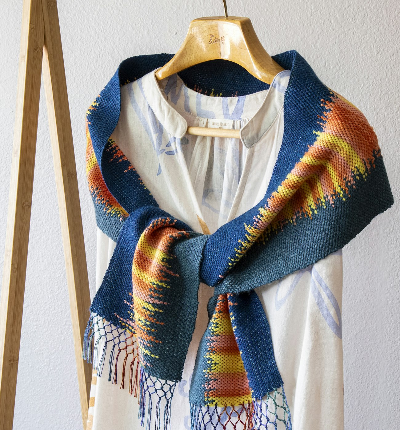 The underlying weave structure for this scarf is plain weave, so it requires only two shafts. The warp consists of three wide stripes (blue, orange, and blue), roughly aligning with the areas of weft colors. As you thread, warp ends should alternate between the two shafts. Tie up one shaft to one treadle, and the other shaft to a different treadle. As you weave, you’ll alternate those treadles.
