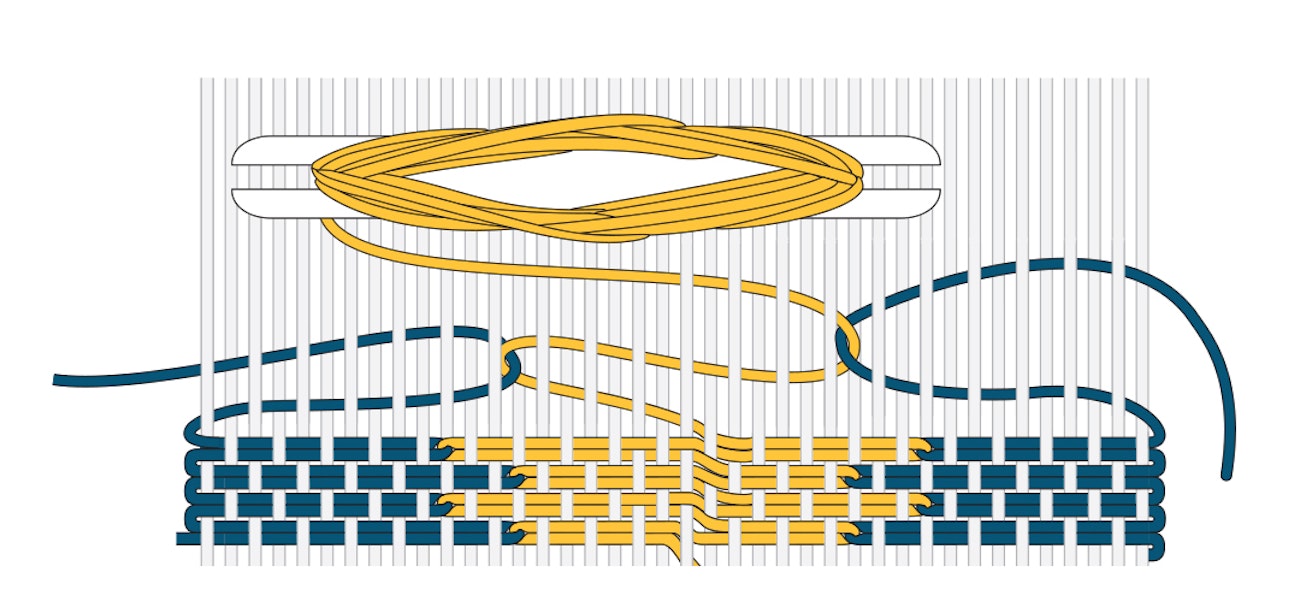 The shuttle holding the central weft yarn loops around the edge wefts. Illustration by Long Thread Media