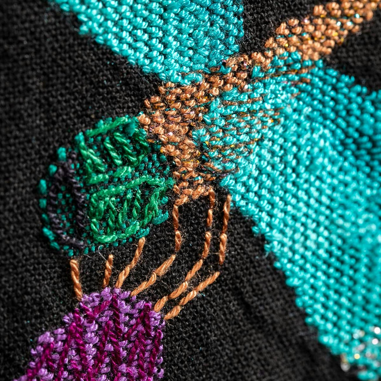 Various inlay yarns create complex details, helped along with a few touches of embroidery.