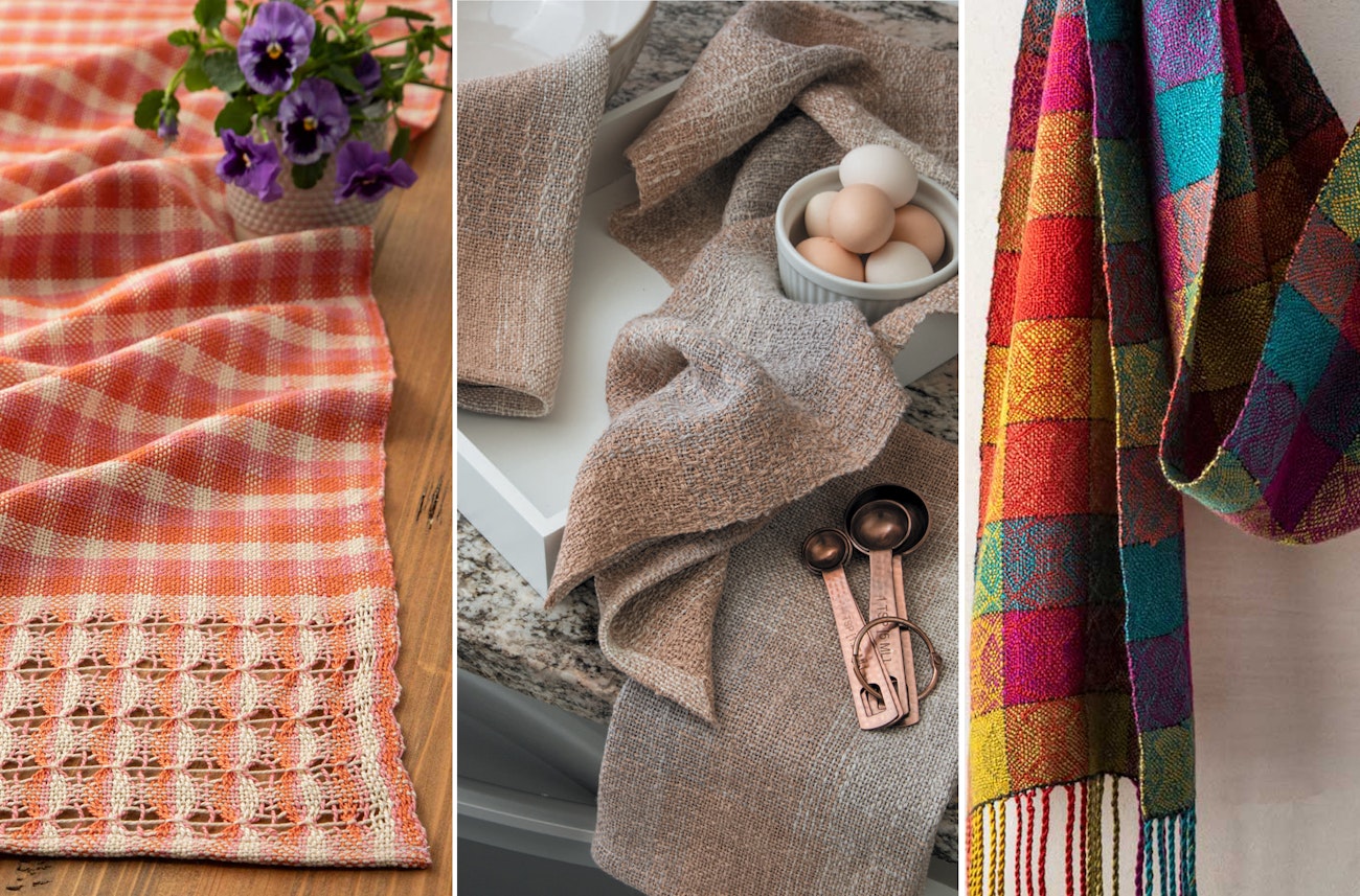 From left, Cathy Wilcox‘s Wild Rose Runner; Dana Lutz‘s Beachcomber Towels; and Eileen Lee‘s Autumnal Mosaic Tiles Scarf.