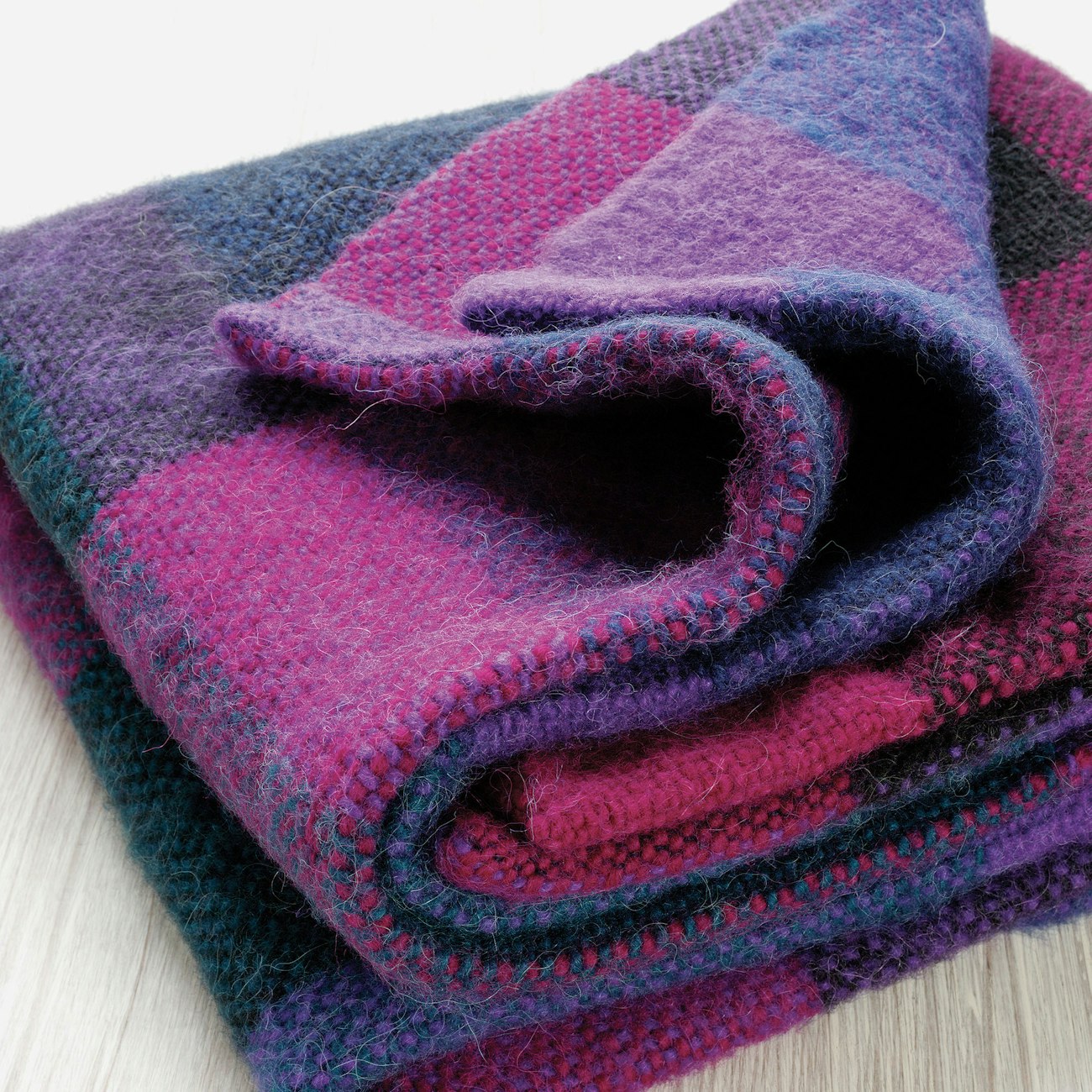 This free pattern collection includes a lush brushed plaid blanket from Liz Moncrief,that is simple to weave and cheering to use, in jewel-toned alpaca-blend yarn. After weaving, hemming, and fulling, you'll brush the nap up with a pet brush to create a fluffy cushy huggable blanket.