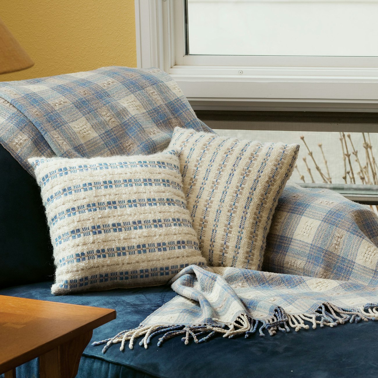 To satisfy your inner Martha, weave a coordinating throw and pillows in monk's belt, plaid, and lace. This project from Rita Hagenbruch will grace any room, any time. The blanket is a 4-shaft combination of huck lace and twill, and the pillows are woven in 4-shaft monk's belt. Rita used a calming color palette of natural, blue and tan. Weave them as she did or design a palette that fits your own decor.