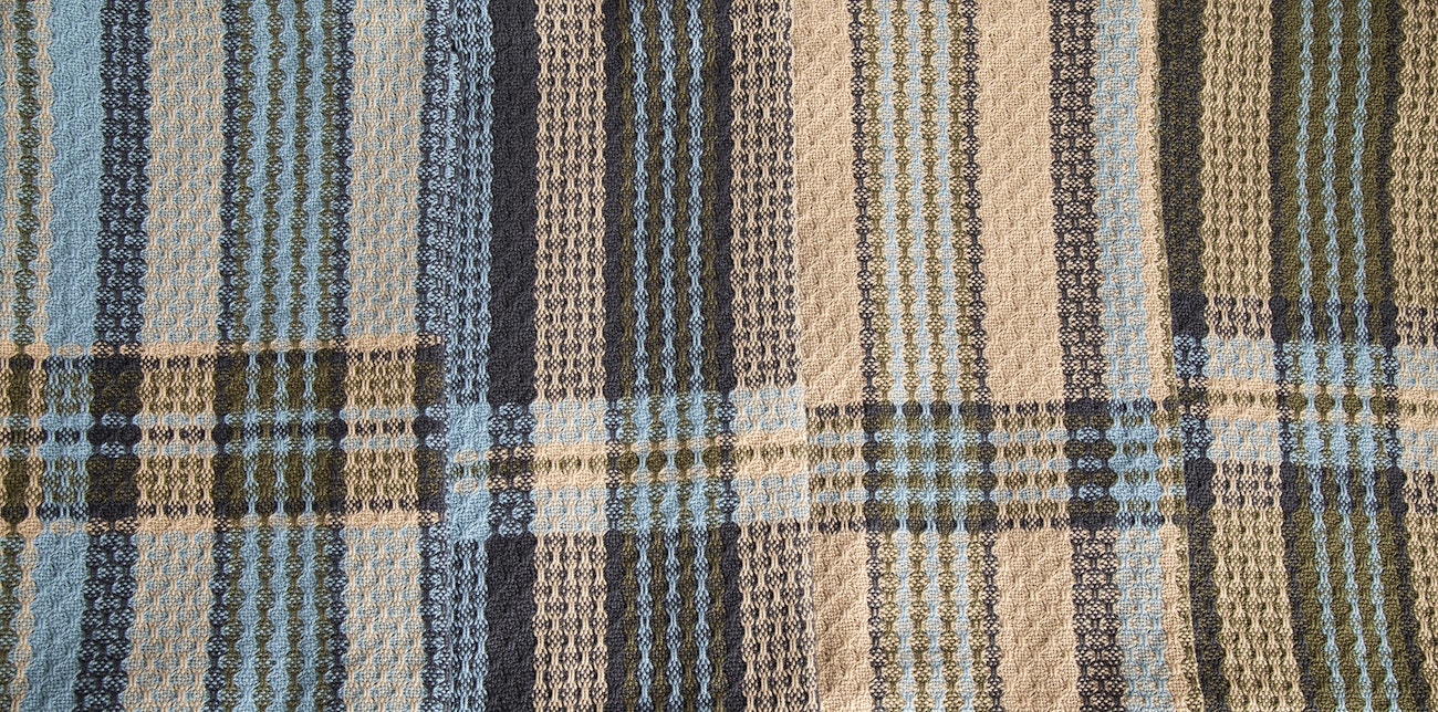 Huck spots are my favorite structure for weaving dish towels, as they give an interesting and absorbent texture and look great in stripes or, even better, when woven as threaded to make plaid. When woven in plaid, you can really see the rounded shapes formed by the shifting of the huck spots during wet-finishing. I find those little spots delightful!