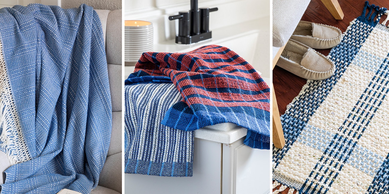 Bonus projects for subscribers, from left: Cuddle Up Throws by Malynda Allen, Be Our Guest Hand Towels by Jennifer E. Kwong, and the Cozy Toes Rug by Kate Kilgus.