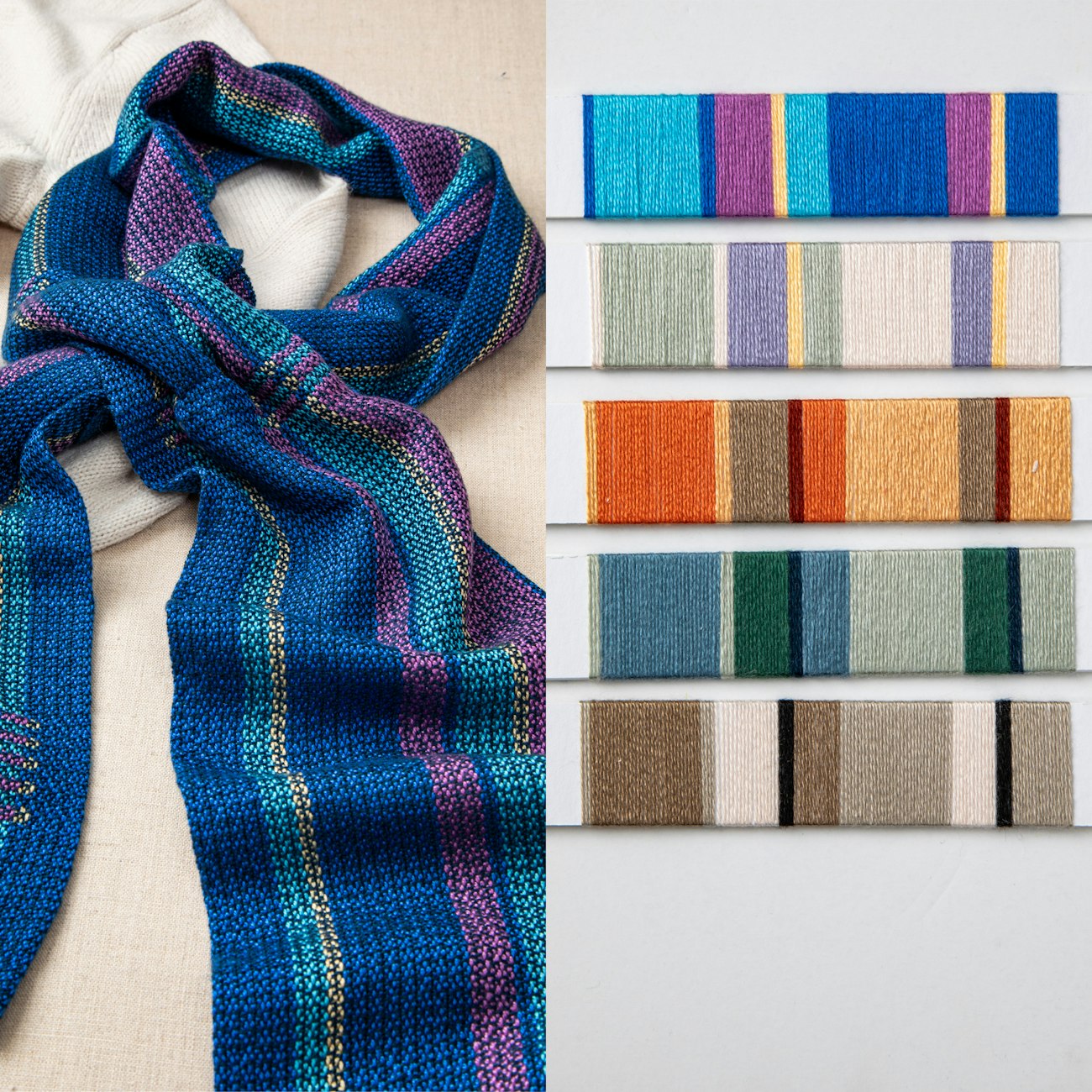 While her version is woven in a pair of blues, plus magenta and a bit of yellow, she made yarn wraps to show four other color combinations—pastels, warm shades, cool shades, and neutrals (shown above with her original colorway at top).