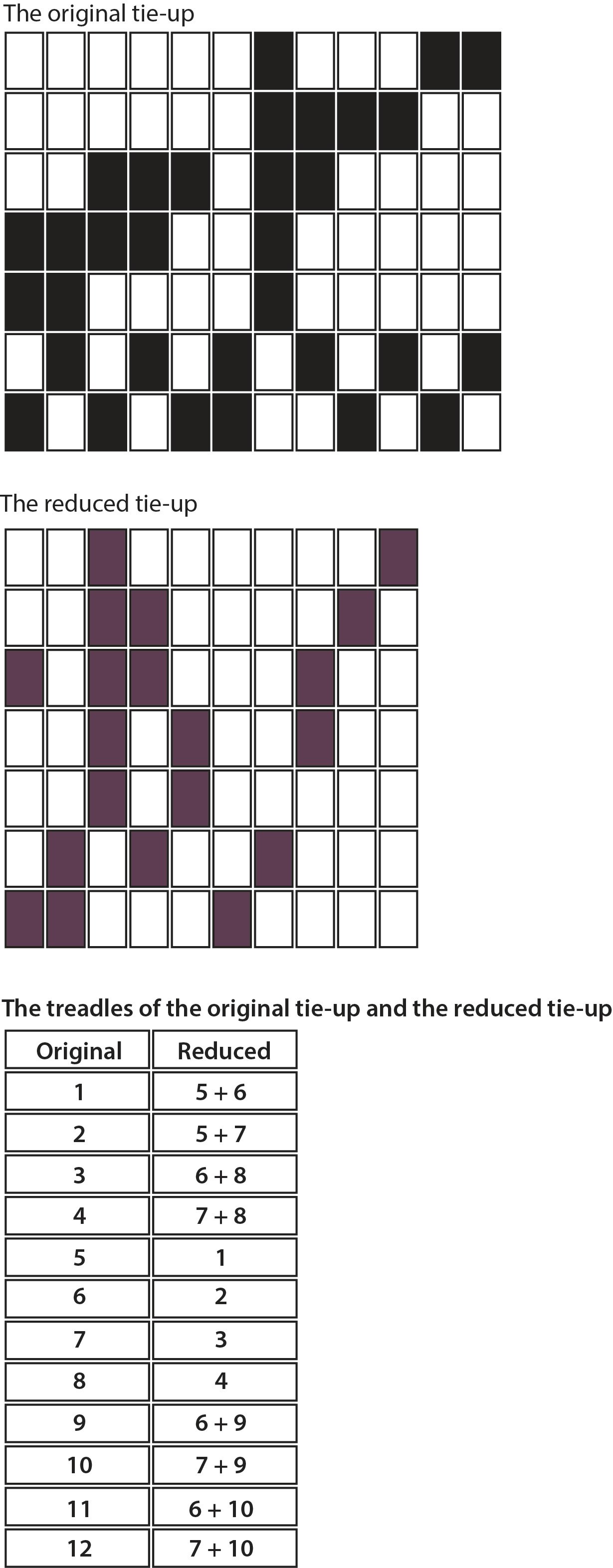 If retying doesn’t seem like a sensible option, I put the tie-up into Tim’s Treadle Reducer and convert it into a skeleton tie-up that uses multiple treadles per pick. A skeleton tie-up will mean using two feet in some spots of the treadling and can take some time to get used to but tends to become second nature after a short while. Results from a treadle reduction will look like this: