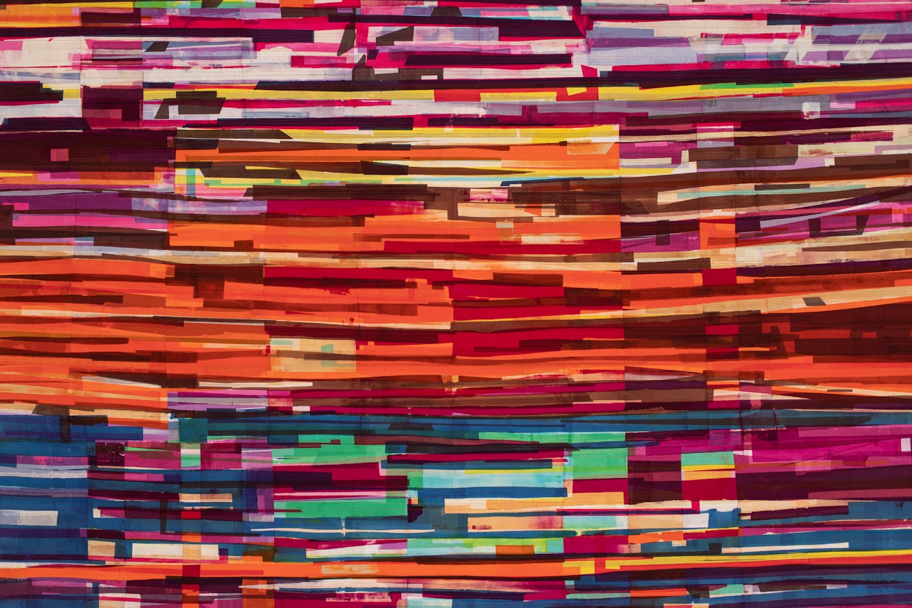 Event Horizon No. 1, 2022 by Rodger Blum, American (b.1962) is a stunning example of improvisational silkscreen and hand painting with reactive dyes. Photo courtesy of the artist and J. Kevin Fitzsimmons, photographer.