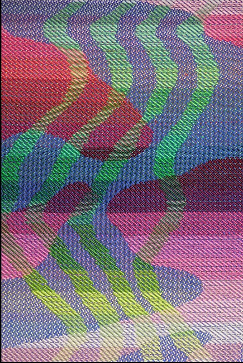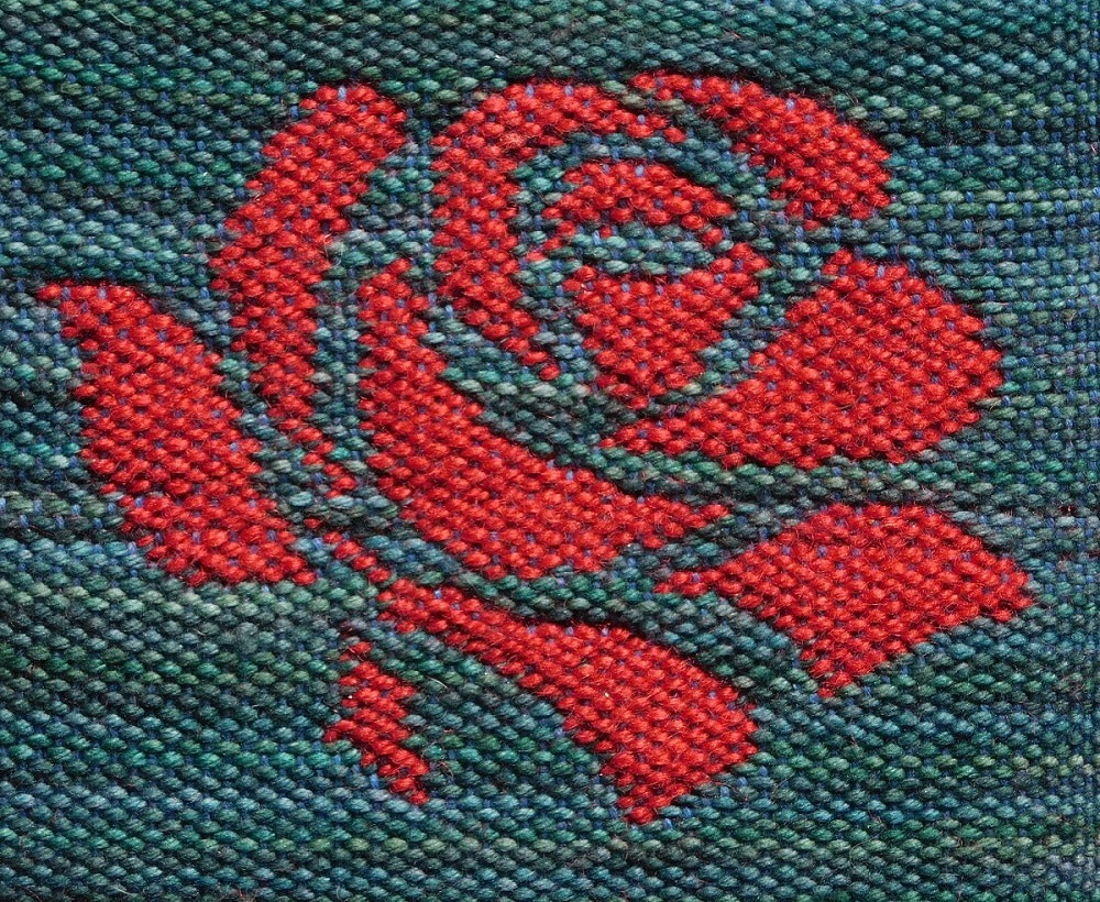 Why would you do that? If you combine the ability to weave multiple structures (or multiple faces of the same structure) in a single pick with a cartoon of the type you’d use when weaving tapestry, you can weave curves and images such as the samples you see below and at the beginning of this article—with no need for pick-up sticks, extra shafts, or shaft-switching. The woven results are not damasks or brocades, but they have some characteristics of those structures while requiring only a fraction of the effort.