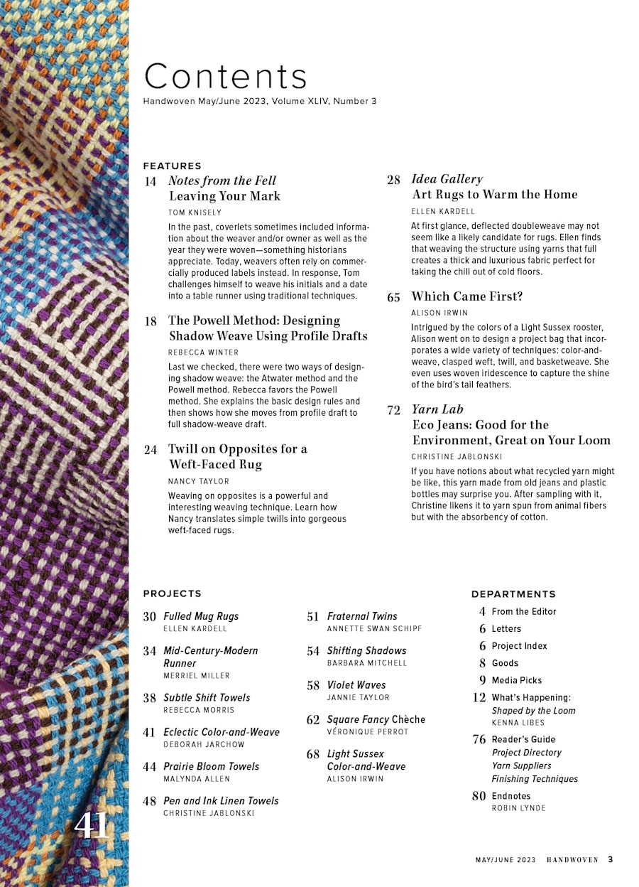 This is a technique-strong issue with three articles about design and one about weaving rugs using deflected doubleweave, a structure not well-known for rugs. Tom Knisely talks about the usefulness of marking your work for future generations and the method he learned for adding initials and dates to weaving projects. The “Yarn Lab” details a special yarn made from recycled plastic bottles and old jeans, and “What’s Happening” describes a not -to-be missed exhibit about Navajo weaving. From “Endnotes” you’ll learn about a unique way of weaving temperature blankets, one that you may want to try!