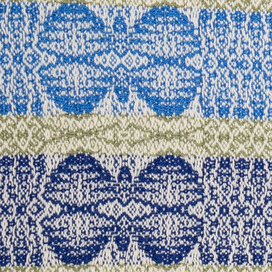 After finishing a scarf, designer Tina Glassenbury had some spare warp and decided to experiment with alternative treadlings. One of these new motifs reminded her of a moth, so she refined the design using Fiberworks until she was happy with the shape—and then moved on to trying out weft colors. She found that the most pleasing effect used colors of similar saturation for the motifs, and less saturated colors for the stripes in between—and she turned her samples into wall hangings.