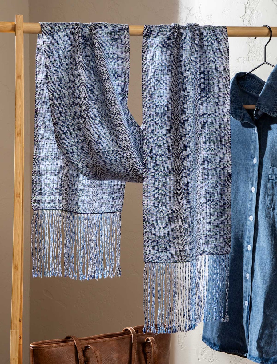 During a drive through some stunning scenery, designer Annette Swan Schipf noticed how the sunlight hitting one specific river created a beautiful glimmer that reflected in the current. She found a draft on Handweaving.net that looked like ripples in water, fiddled with it in Fiberworks to change the edges and reverse the pattern direction several times along the length of the scarf. A fine opalescent thread alongside the light yarn in the shadow weave structure replicates the sun’s reflection on the water while waves in shades of blue ripple around it.
