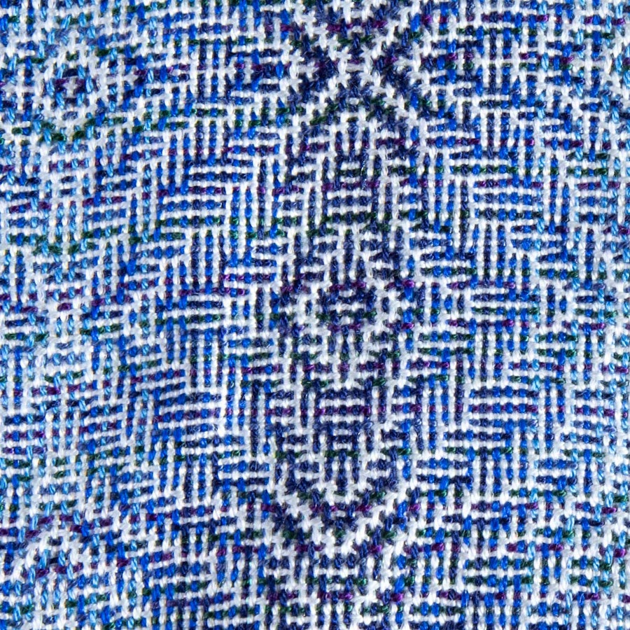 Warp: 8/2 Tencel (100% lyocell; 3,360 yd/lb; Valley Yarns; WEBS), Azure, 81 yd; Royal, 180 yd; Navy, 153 yd; Natural, 405 yd. Sulky Sliver Metallic Thread (250 yd per spool; Sulky), #145-8040 Opalescent, 2 spools. Note: Annette originally used Opalescence fine thread in Iris (Henry’s Attic), which has been discontinued.