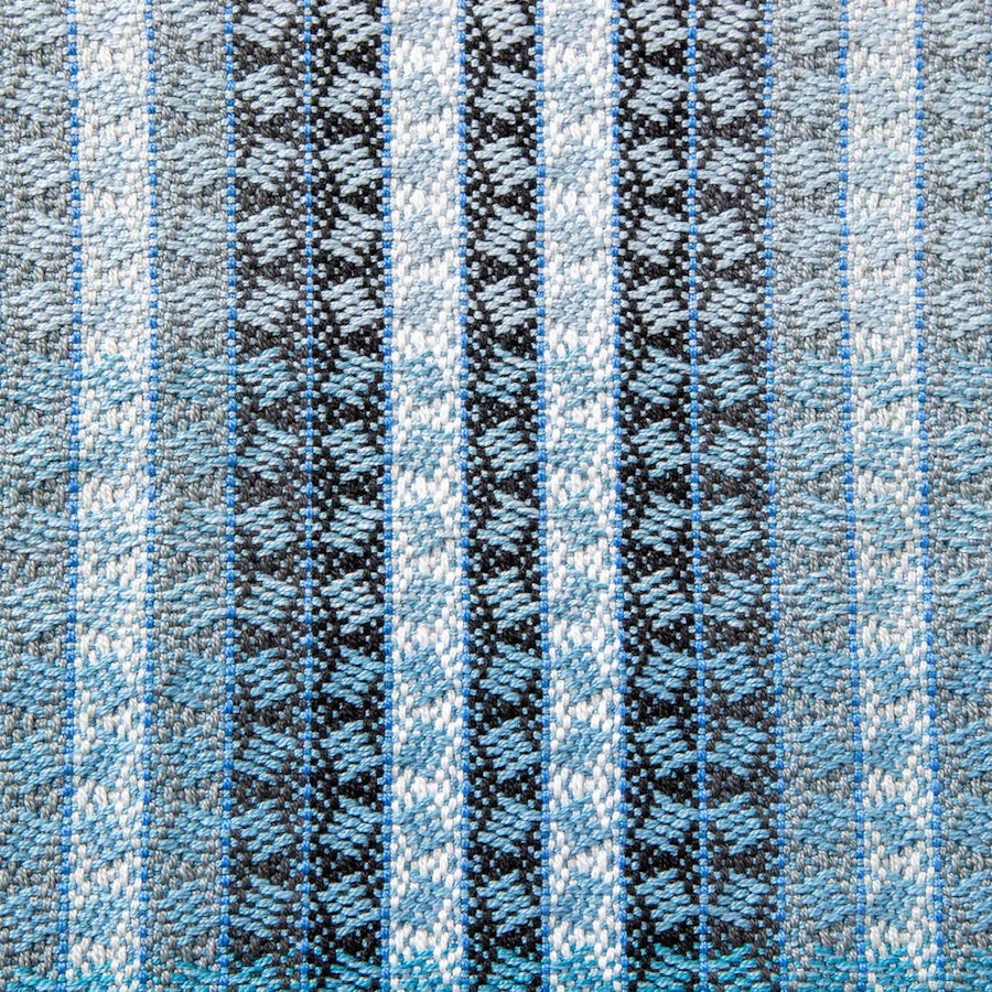Warp: 10/2 pearl cotton (4,200 yd/lb; UKI/Supreme), #125 Pacific Blue, 216 yd; #116 Black, 504 yd; #01 White, 288 yd. 10/2 mercerized cotton (4,200 yd/lb; Lunatic Fringe Yarns), Very Dark Gray and Middle Gray, 576 yd each; Very Light Gray, 288 yd.