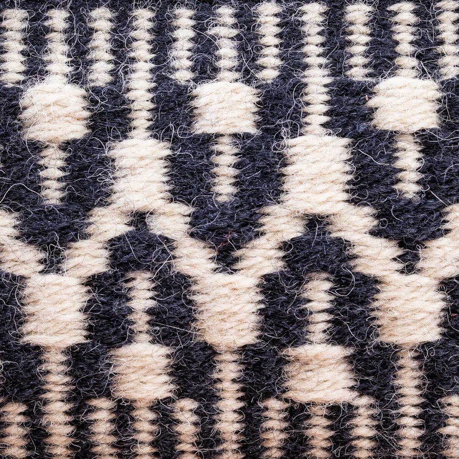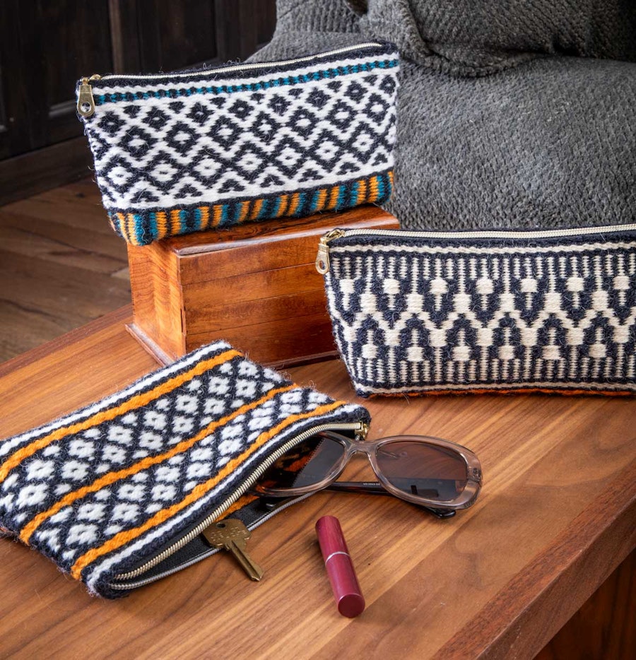 Designer Emily Barth has a great appreciation for the subtle beauty of moths, which are so often overlooked compared to their flashier butterfly cousins. She chose three boldly patterned moths (ailanthus webworm, giant leopard, and virgin tiger moth) as inspiration for these boundweave zipper bags, which she thinks of as little cocoons for all the bits and bobs that you can store inside. The bottoms of the bags are different from the sides, mimicking the way many moths hide contrasting colors under their wings. Three-dimensional box corners are usually formed by folding and cutting fabric, but bulky boundweave does not lend itself to this method. She solved that problem by weaving each bag in an irregular shape on the loom. Not weaving selvedge-to-selvedge in the center section (which becomes the bottom of the bag) creates just the right shape to sew up with no waste, no raw edges, and no bulky seams.