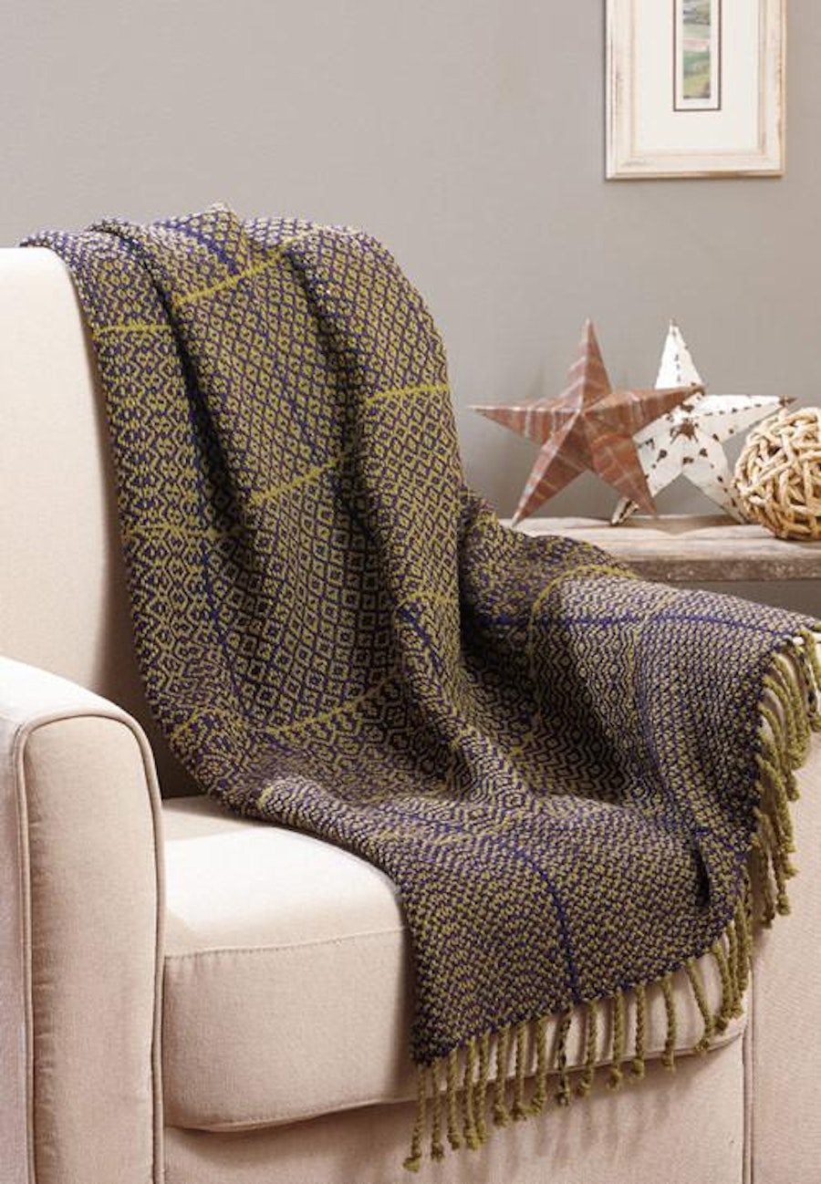 Elegant Gamp Lap Robe by Suzie Liles. Suzie wove her version of this twill gamp using bronze and violet Harrisville Highland wool, but you can use any two colors that you like—or even use different colors in each threading block and cross them with the same or different colors in the treadling blocks.