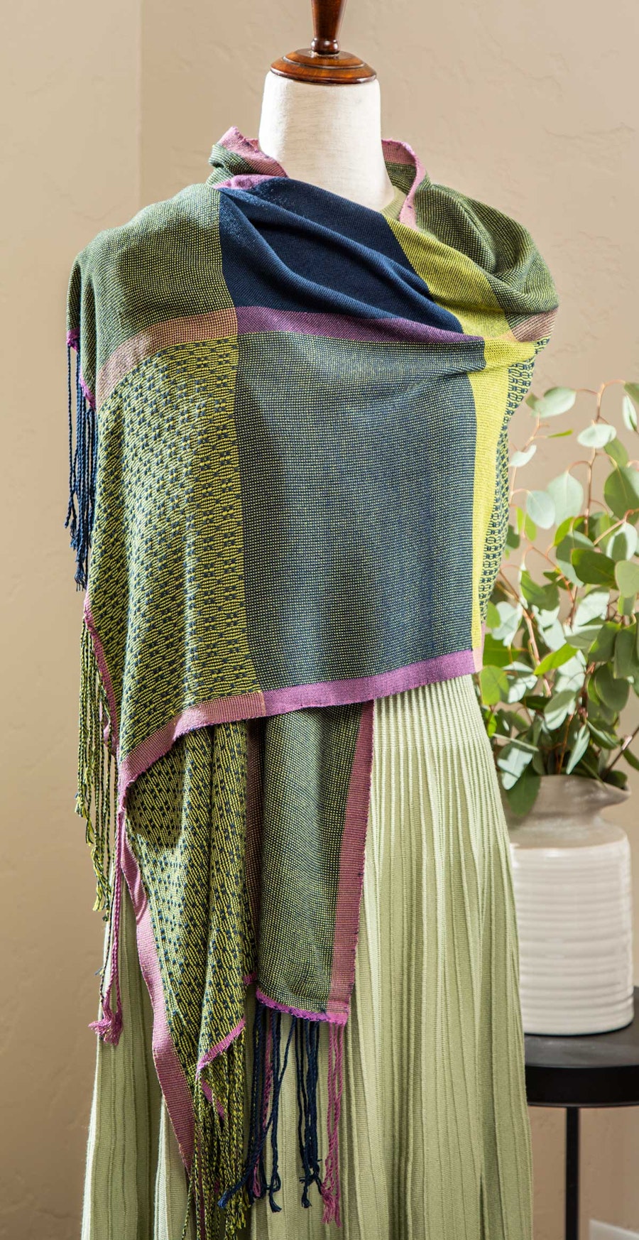 Weft: 16/2 Bamboo, #BB8026 Bordeaux, 17 yd; #BB8019 Navy, 712 yd; #BB4269 Limette pâle, 600 yd.Dimensions