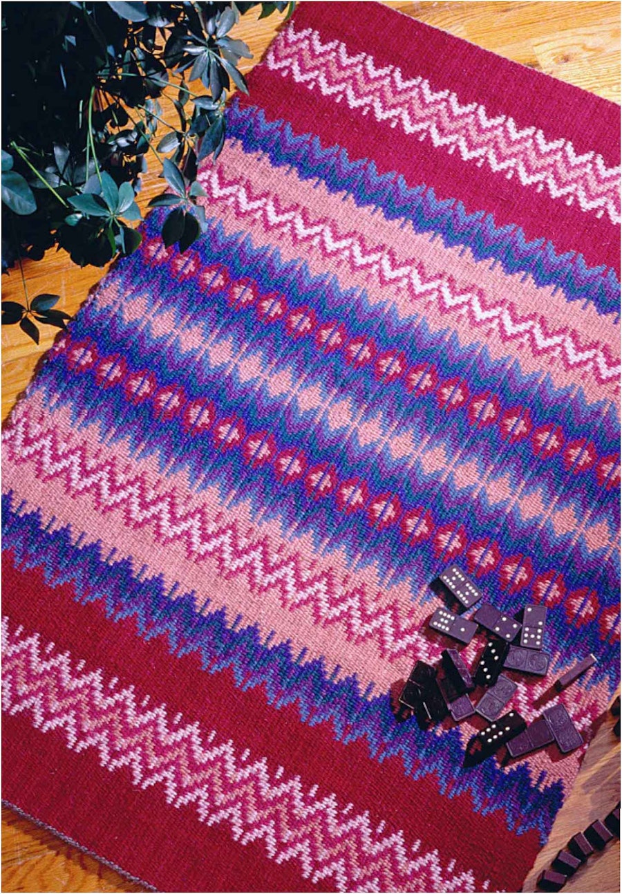 Weft: 3-ply rug wool (Halcyon Yarn) at 266 yd/lb), 600 yd dark red (#109), 315 yd grayed salmon (#135), 210 yd deep rose (#110), 120 yd blue-violet (#119), and 115 yd each grayed pink (#139), medium blue (#122), purple (#115), and dark teal (#154).>Dimensions