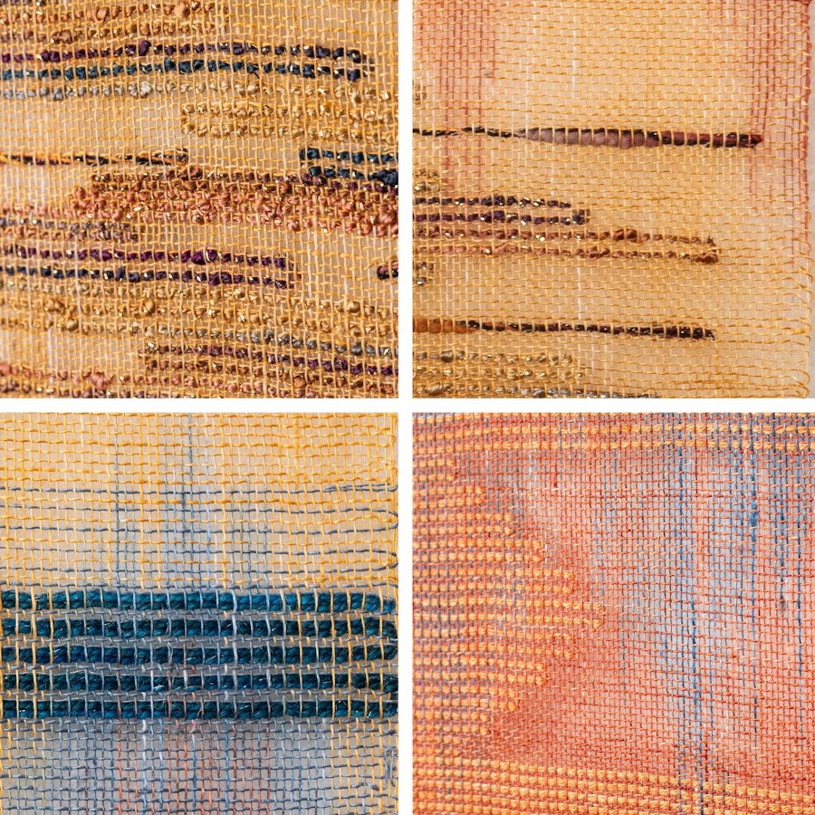 The basic format of transparency weaving is a loosely woven ground cloth, usually linen, interspersed with supplementary weft inlay. Areas of ground weave remain see-through—more translucent than transparent—while areas with supplementary weft become opaque. The inlay is typically used to create tapestry-like imagery, either pictorial (think birds and flowers) or abstract (think geometric shapes).