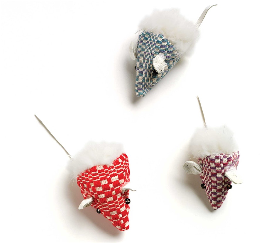 Designer Margaret Anderson weaves a lot of monk’s belt (a variation of overshot in which two blocks alternate throughout). Varying the sizes of the blocks creates designs with more interest than a simple checkerboard. Simply changing the pattern-weft color gives each section of fabric a new look and makes her heart soar! She has devoted a table loom entirely to monk’s belt for small items: tea cases, cards, ornaments—and these little cat toys. Only one pattern-weft color is used for each of the mice shown here, but including different colors within the fabric for a single mouse would make weaving it even more fun!