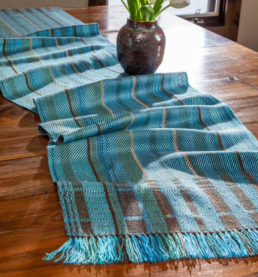 Mimicking the butterfly that inspired it, one side of this runner is vibrant with blues, and the other is a subdued camouflage brown. Weave it as written, or improvise your own version with the help of treadling blocks.