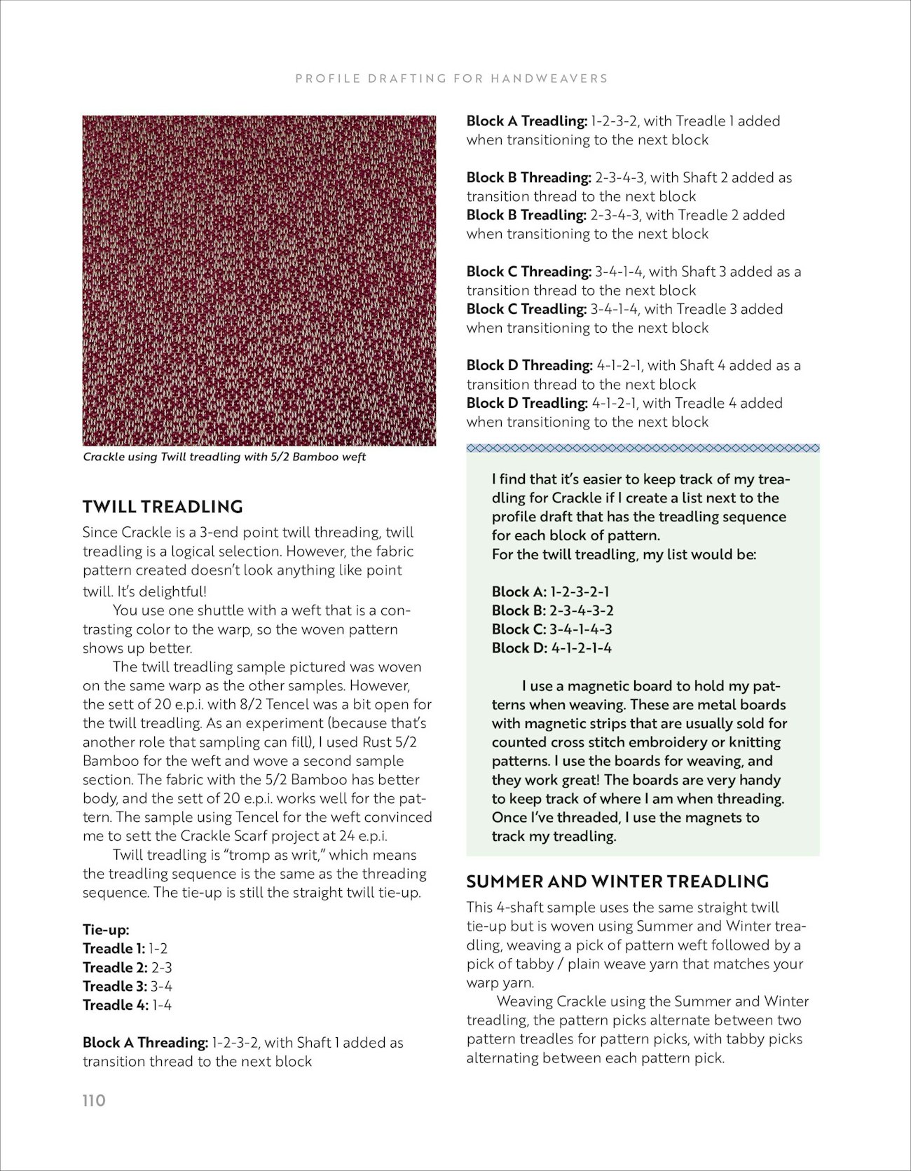 The chapter for each structure includes information about its tie-up, threading, and treadling blocks. On this page, crackle is tromp-as-writ, with transition threads added between different blocks in both warp and weft. You don’t need a full draft to thread, tie up, or weave the crackle sample on this page—just follow the order of blocks in your profile draft.