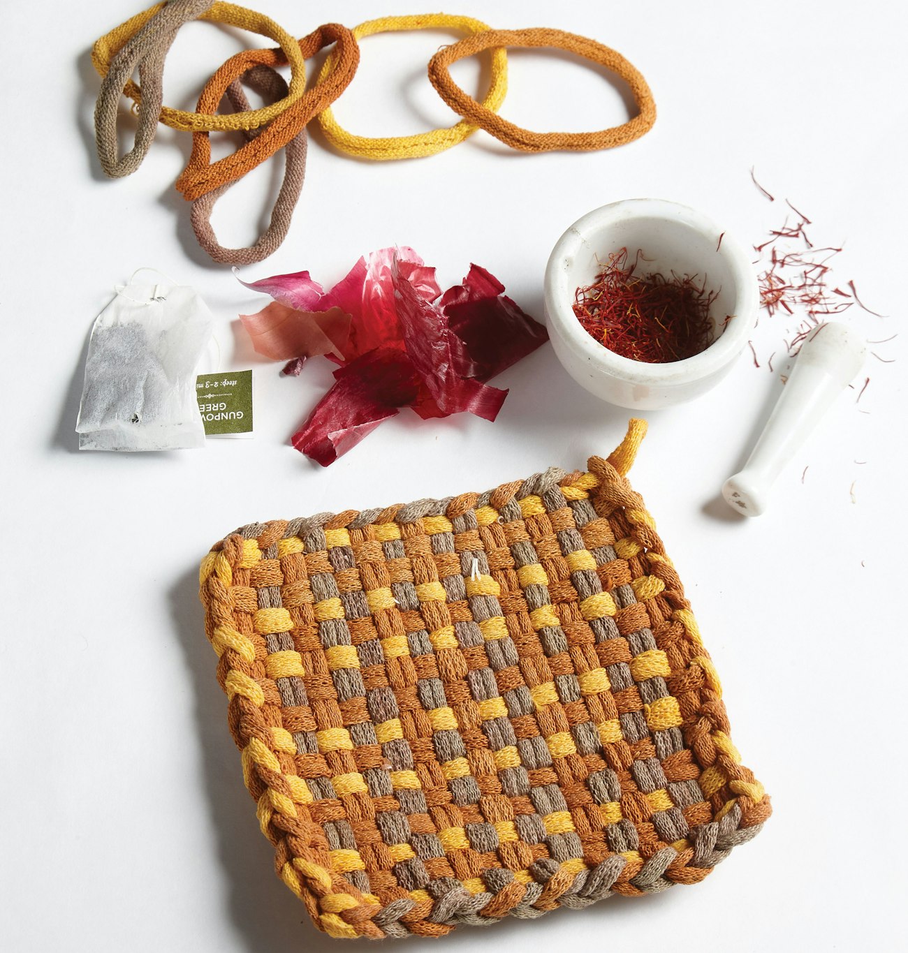Explore color by dyeing your potholder loops as shown in the book Nature's Colorways from Long Thread Media. Green tea, pickling alum, onion skins, and a dab of saffron result in cheerful, almost edible colors on cotton jersey loops. Photo by Joe Coca