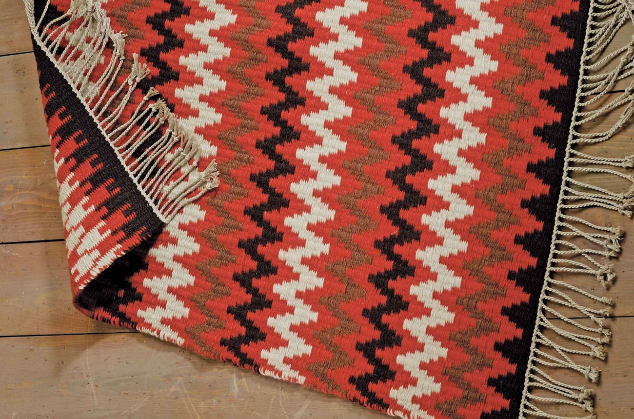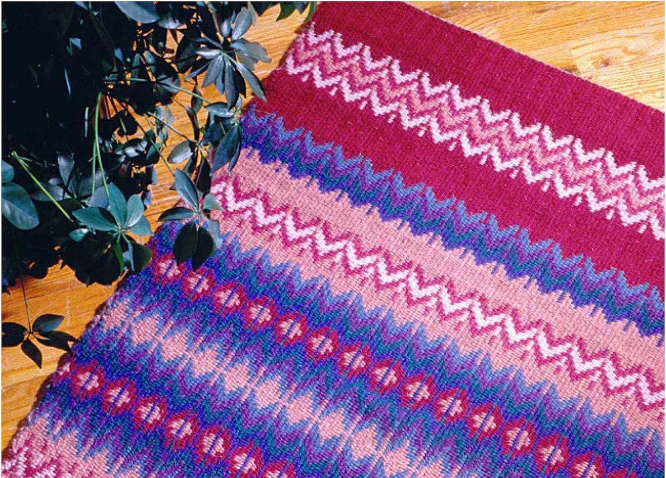 Krokbragd is a three-shaft version of boundweave. Wynne Matilla wove this krokbragd rug for the comfort of Arrow, her old golden retriever, using contemporary colors. You can find the project in the January/February 1997 issue. Photo by Joe Coca