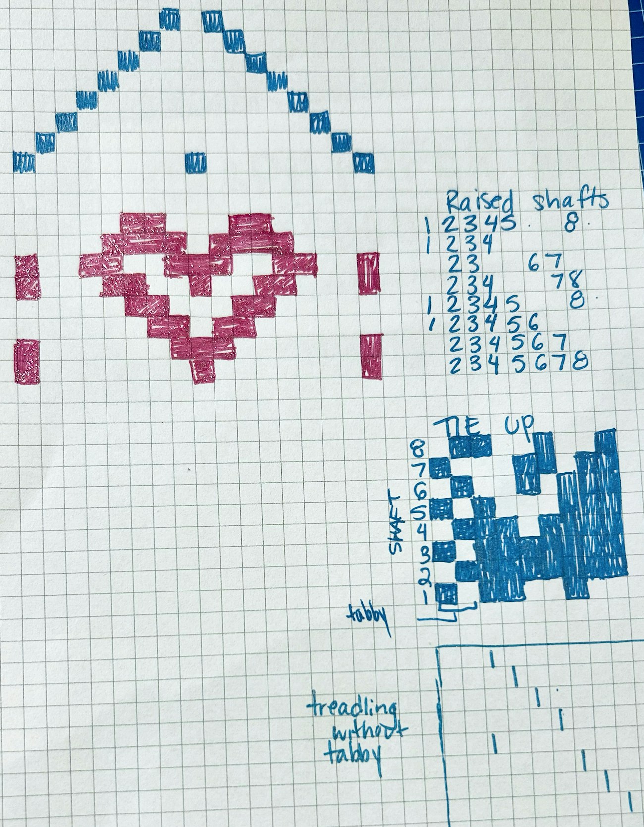 Now the fun starts! Off to the side of the motif, I list every shaft that needs to be raised for each pick (i.e., every square that isn’t colored). As you can see in this heart design, all shafts for red squares stay down during each pick.