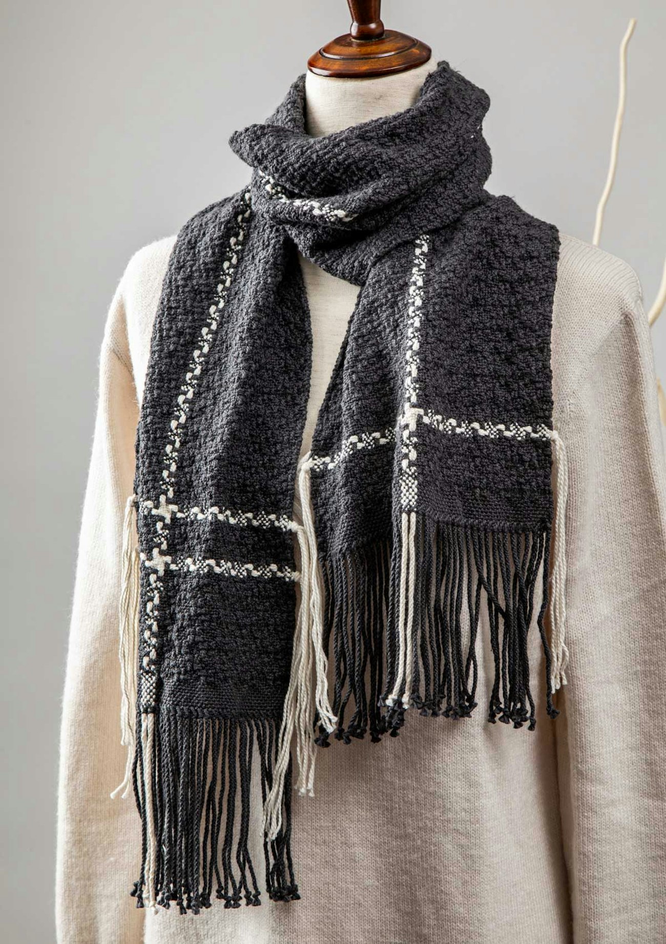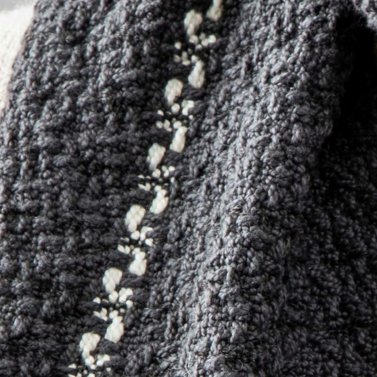 After wet-finishing, charcoal gray wool and cotton woven in a houndstooth-style huck reveal an undulating all-over texture in Rebecca Fox’s design. Occasional stripes of natural create stars radiating beams of light across the piece. Feel free to place your stars wherever you want—or even add more in both warp and weft to create a grand meteor shower!