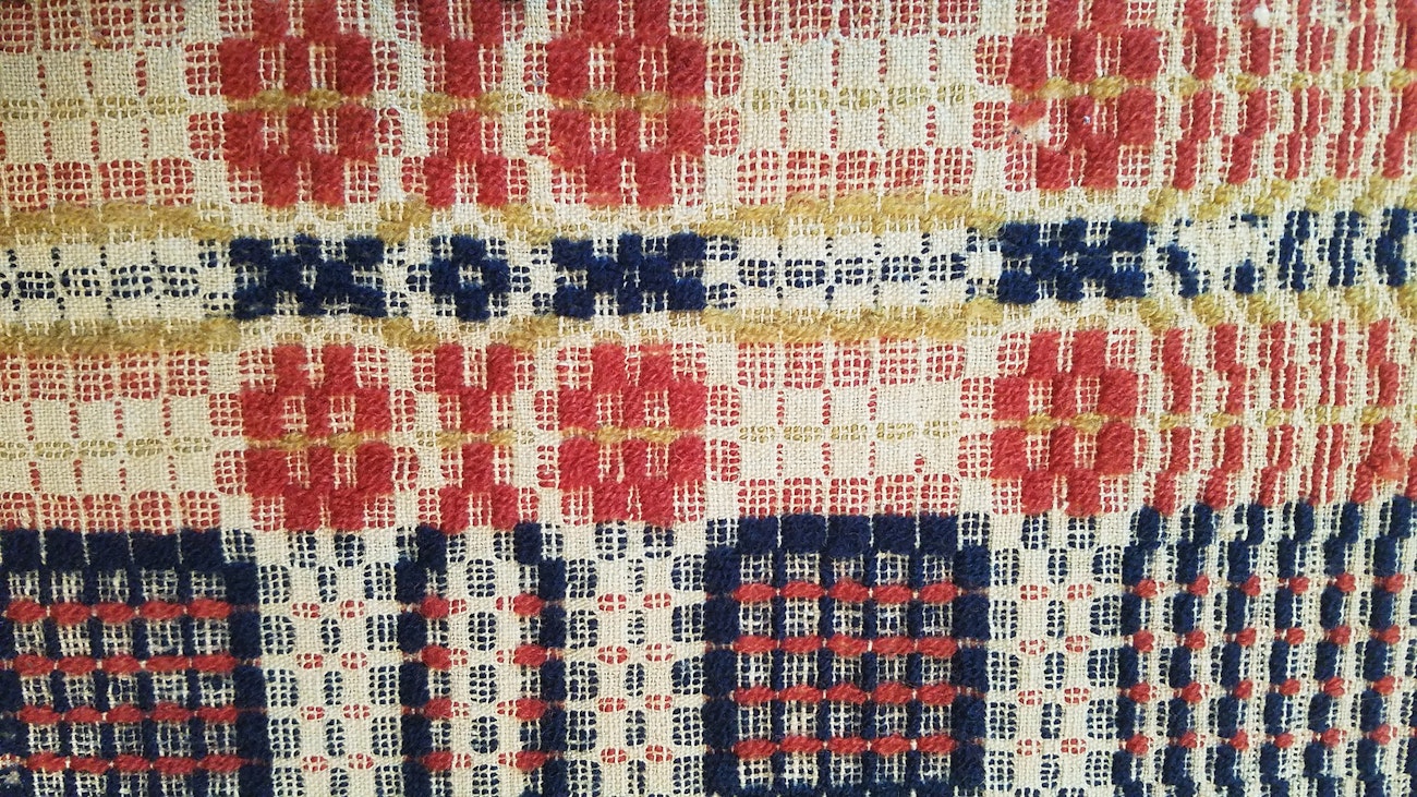 A few picks of yellow add extra energy to overshot woven in the more traditional colors of red and blue. Photo by Tom Knisely