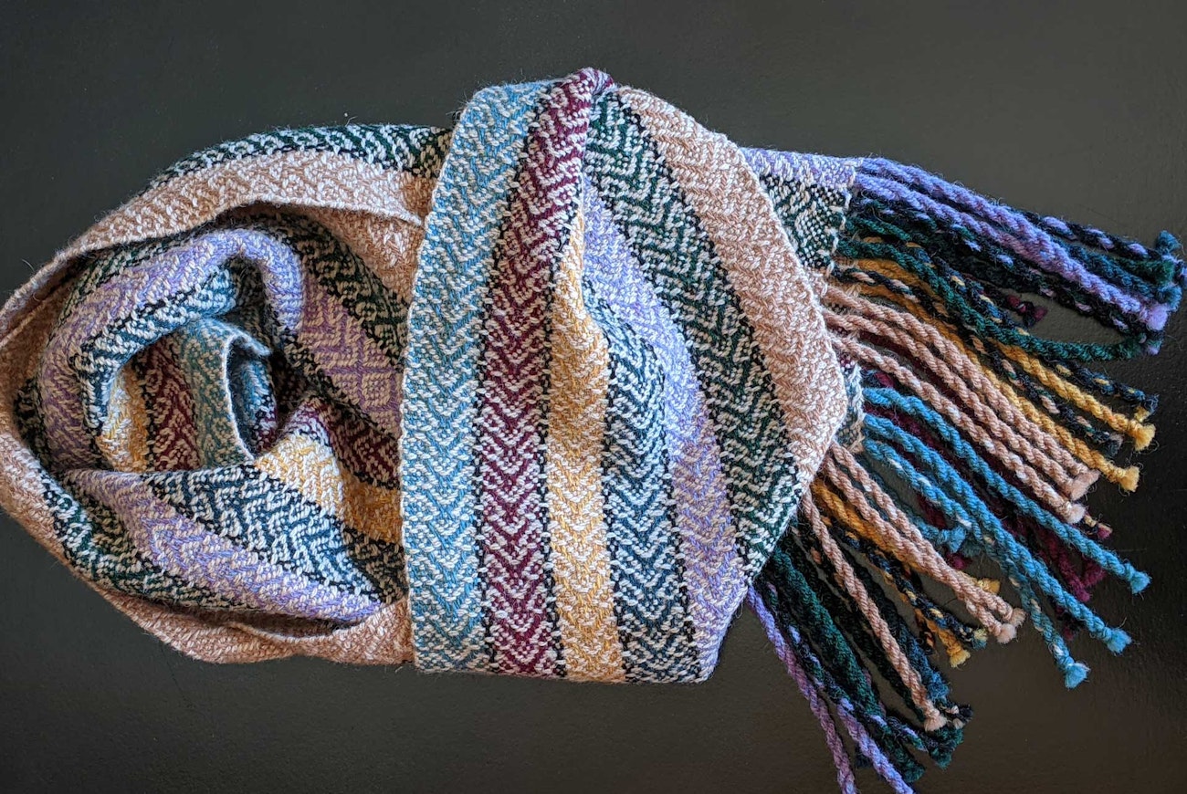 I based my draft on #97 from Strickler’s A Weaver’s Book of 8-Shaft Patterns and added three black warp ends between each color stripe to make them more vibrant. A simple straight-draw treadling created the arrow pattern Macy was after. To complete the eight scarves on time, I enlisted a weaving friend, Rissa Karpoff. When the yarn arrived, I wound the warps and we both began weaving, consulting one another on beat and tension to get eight identical scarves. Rissa and I coordinated by text, photos, and sharing measurements, and in the end, we could not tell the scarves apart when we got together to do the wet-finishing.