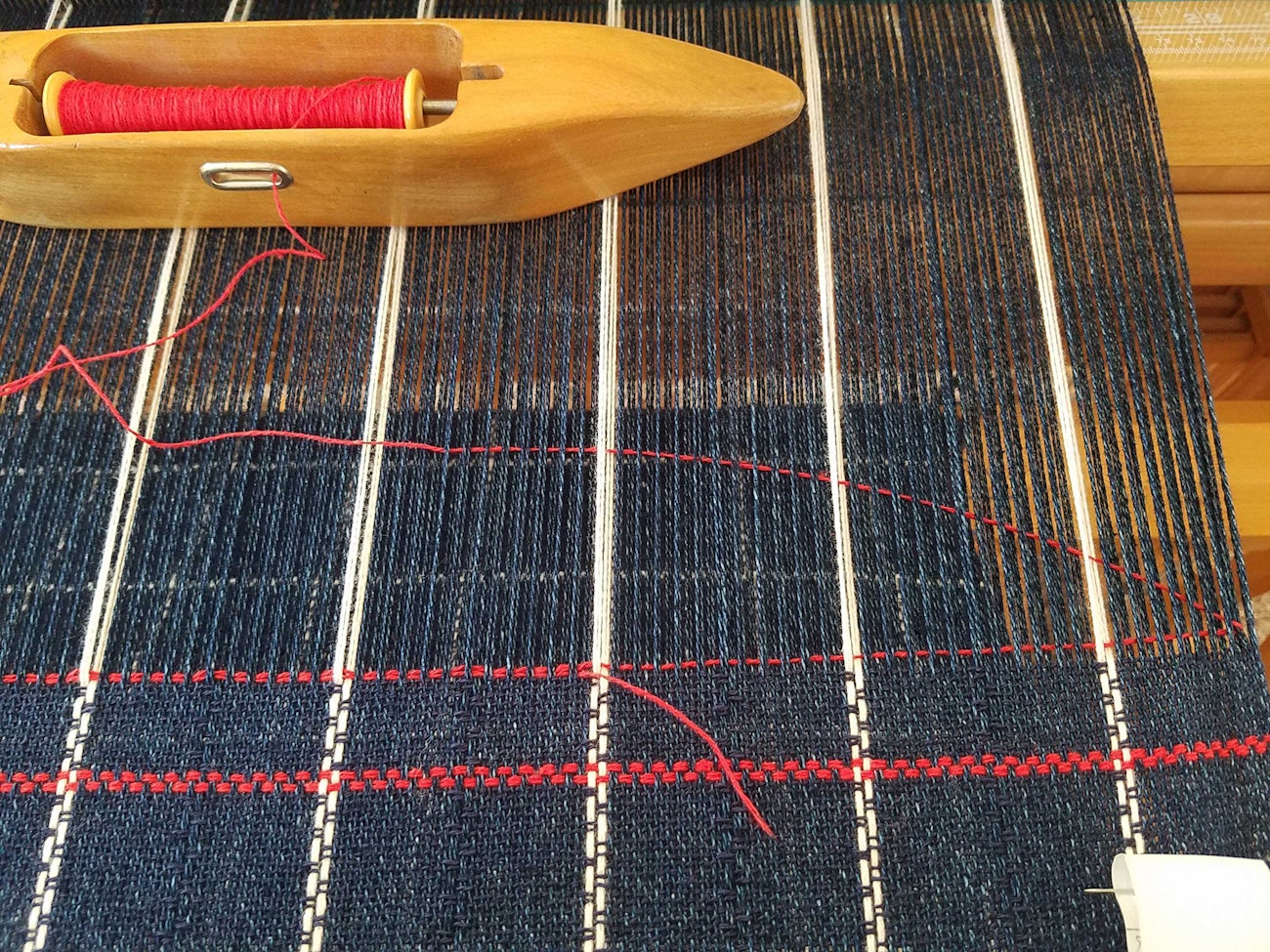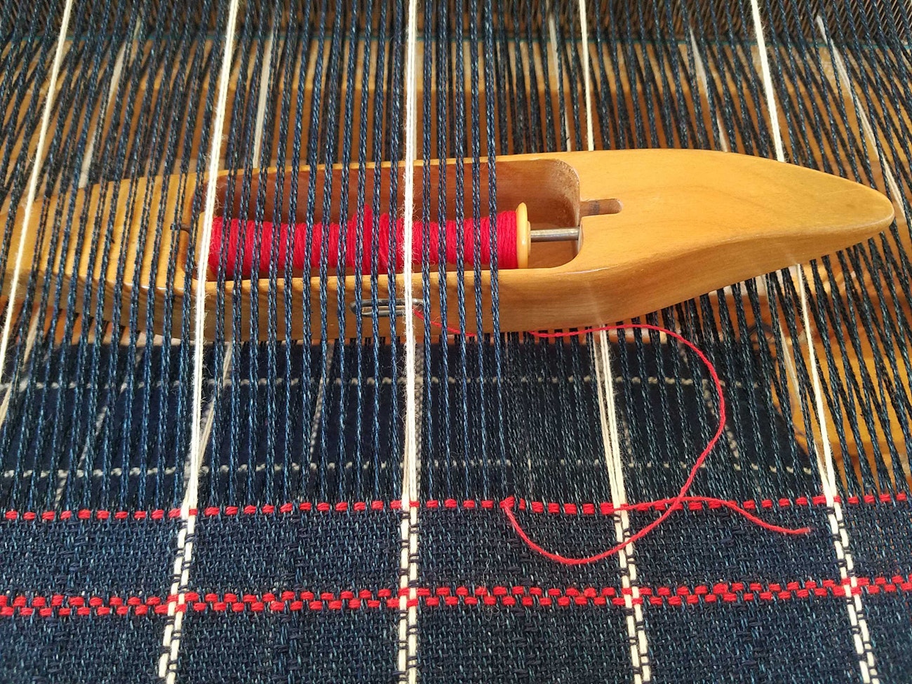 - Change to the next shed. Insert the shuttle down through the warp into the new shed at the same spot and bring it out at the edge. Beat gently.