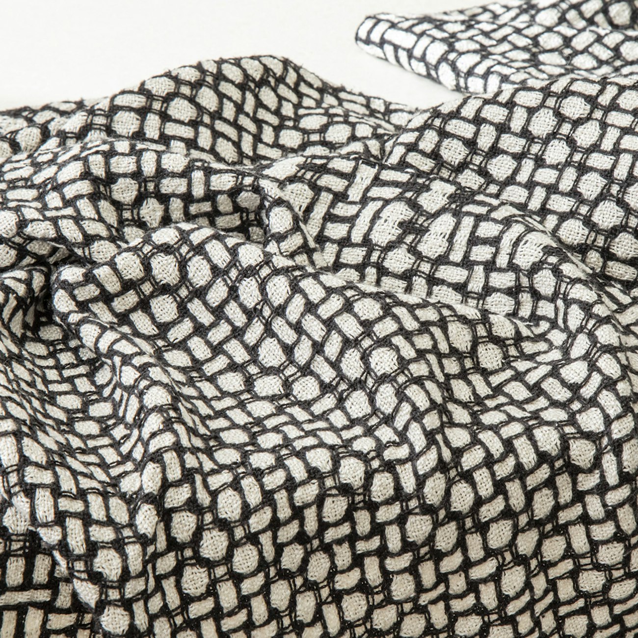 The Treenway Silks Mosaic Scarf Kit comes with Kiku 20/2 spun silk and Alirio-Thinner 20/2 noil silk, each in black and natural, as well as the draft. The warp uses all four yarns, alternating the natural-colored Kiku and noil ends within round and rectangular borders for a rich but subtle texture. This is a two-shuttle weave, using the black noil and the natural Kiku as weft.