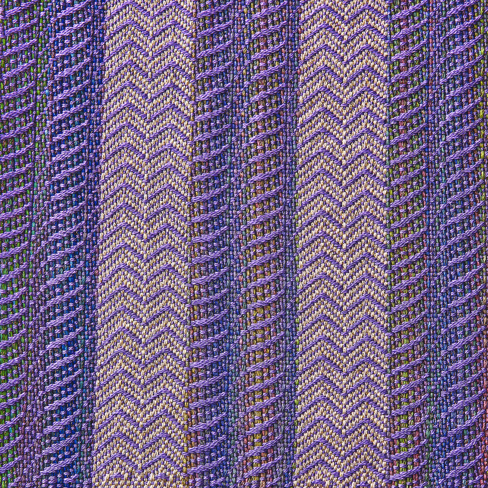 • A straight twill where the treadling reverses, or “turns,” to form points or zigzags (visible in the cream and orange bands shown above).
