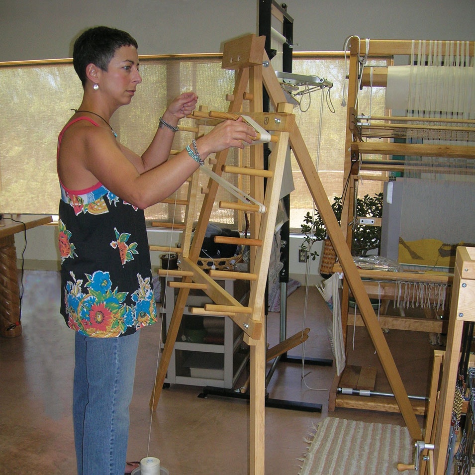 Tapestry artist Lyn Hart of Tucson, Arizona (www.desertsongstudio.com), uses the Spriggs tripod stand from Hill Creek Fiber Studio.