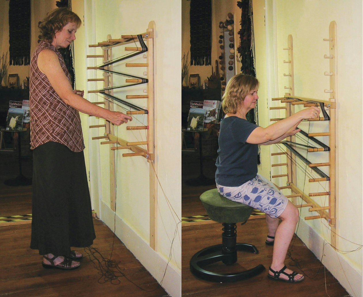 Using notched pegs, fiber artists Ann Keuper (left) and Julie Hul (right) created a height-adjustable wall mount to accommodate weavers who work and study at their studio in Tucson, Arizona. Because winding a warp is a dynamic activity with wide arm movement, it’s not surprising that most people stand. For those who sit, a stool that tilts from its base to move with the body can reduce reaching and straining.