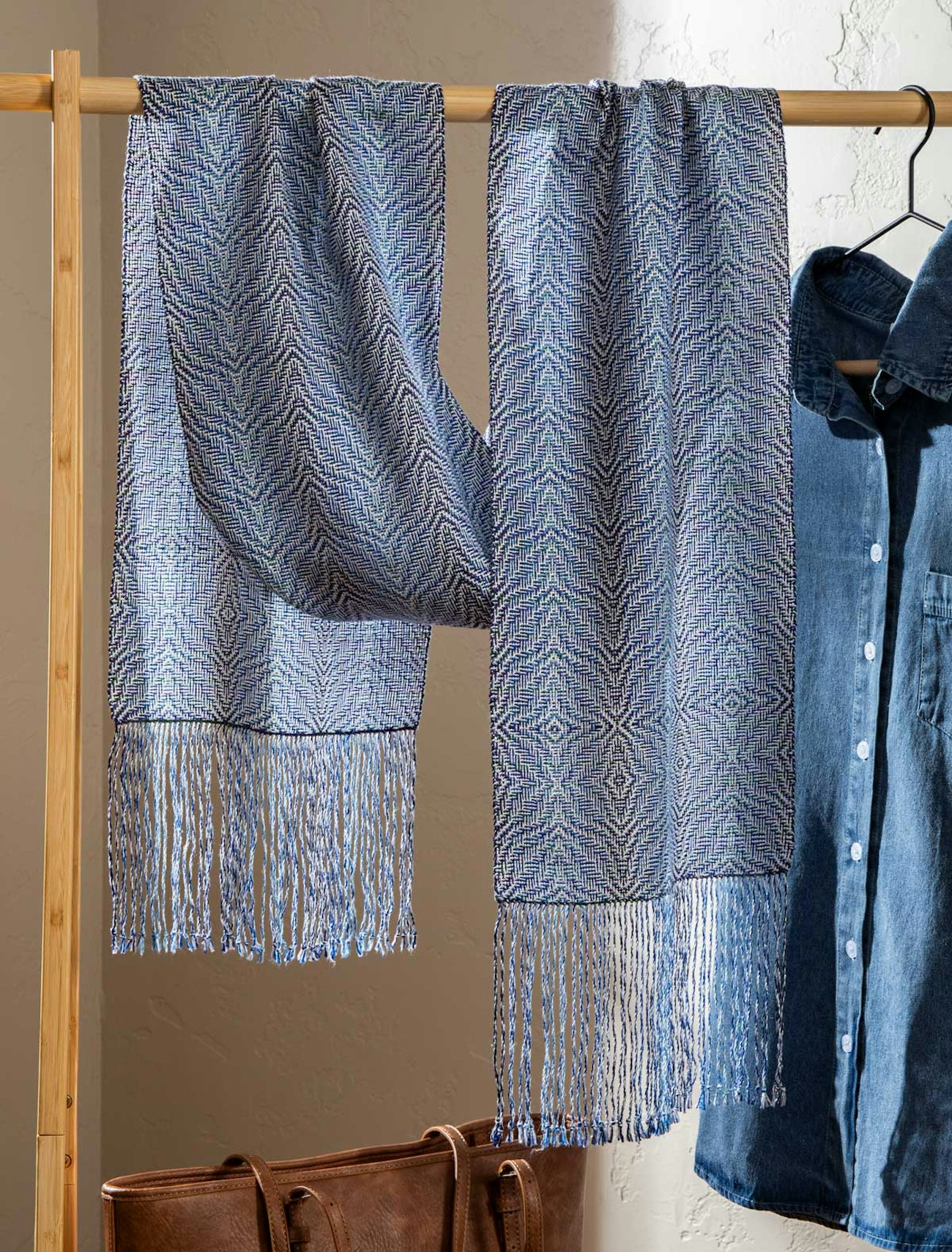 The beautiful Shimmering Water Scarf by Annette Swan Schipf in the Spring 2026 issue of Handwoven uses a widely available fine metallic embroidery thread in the warp alongside ends of Tencel. (We should note that while the thread is shiny and looks metallic, it’s actually made of a thin strand of plastic.)