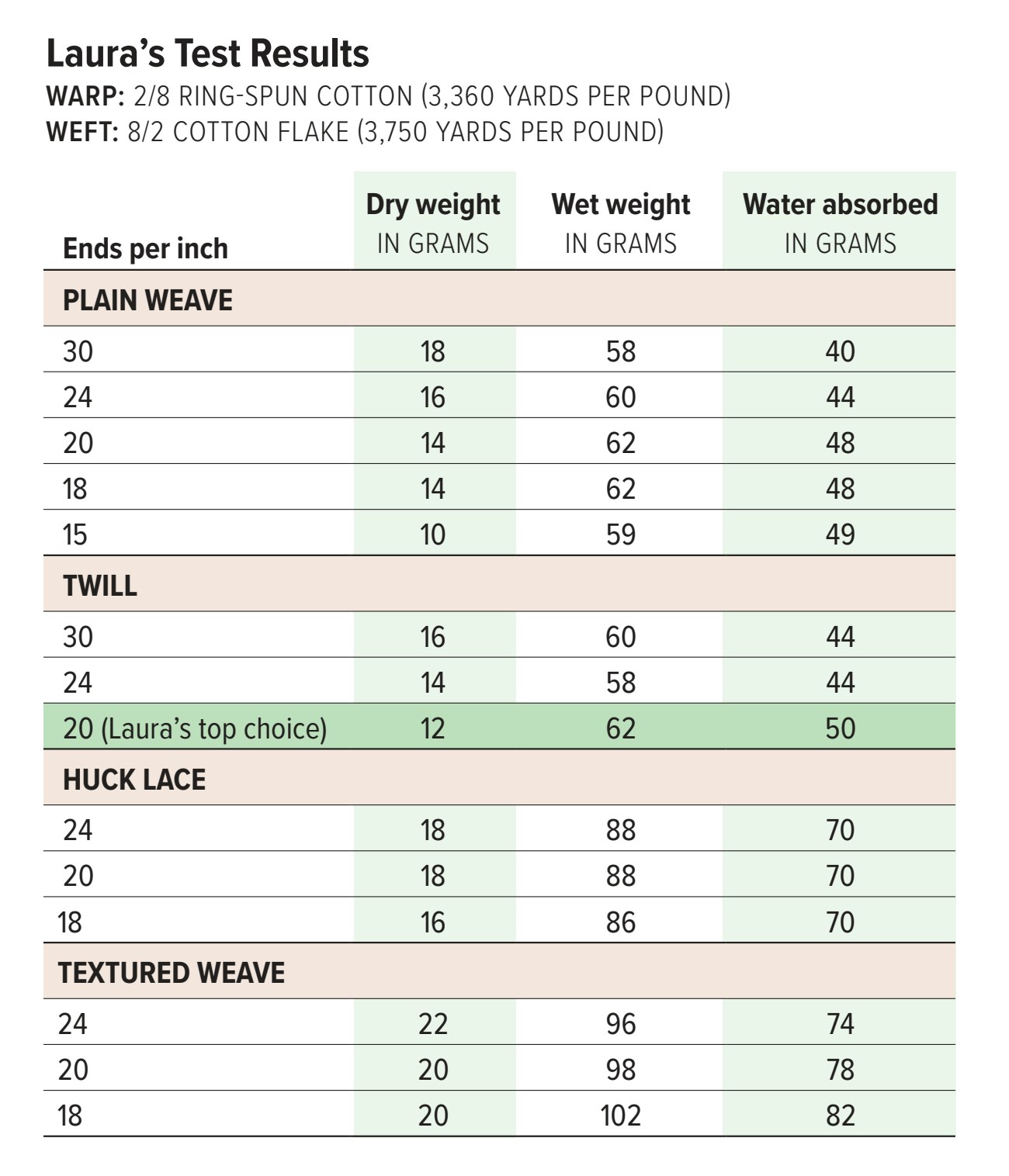 To make a good towel—one that is flexible, absorbent, and durable—I want to strike a balance between yarn size, weave structure, and sett. Taking into account these trade-offs, my preferred combination with these 8/2 cotton yarns is twill sett at 20 ends per inch.
