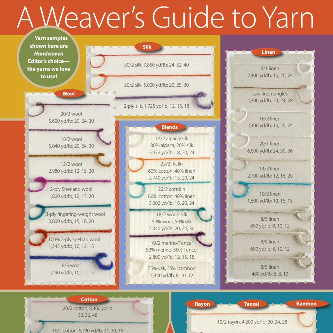 This free yarn guide is a must-have for every craft enthusiast! Besides listing yarn weight and ends-per-inch for a variety of fibers including wool, silk, linen, rayon, blends, and bamboo, you'll also find a "Reed Chart," a "Knitting-yarn directory," and a "Count System" for determining yardage. If you love weaving with yarn and enjoy experimenting with different fibers, then don't miss the opportunity to download this eBook.